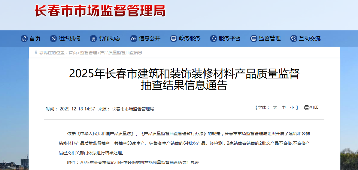 2025年长春市建筑和装饰装修材料产品质量监督抽查结果信息通告